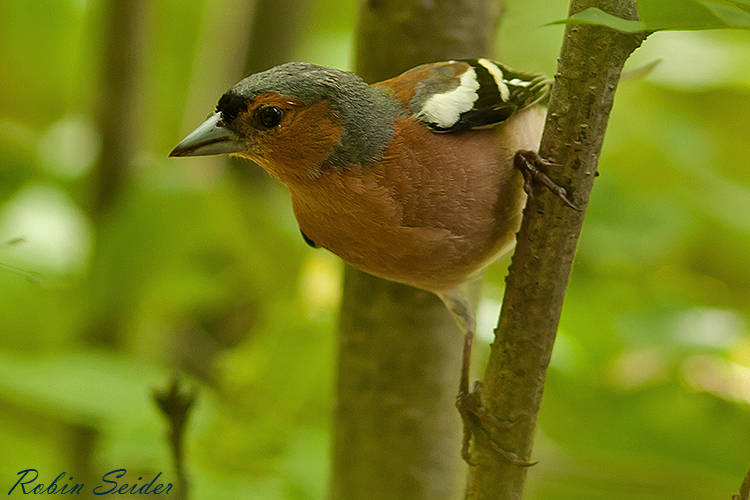 Der Buchfink (Fringilla coelebs) ist ein zur Familie der Finken (Fringillidae) gehöriger Singvogel. Das Männchen hat einen blaugrauen Oberkopf und Nacken, seine Unterseite ist braunrot, der Schnabel stahlblau. Das Weibchen ist auf der Oberseite grünlich-braun, auf der Unterseite heller grau-braun, der Schnabel desWeibchens ist hellbraun. Beide Geschlechter haben zwei auffällige weiße Flügelbinden und einen grünlichen Bürzel. Die Körperlänge beträgt 14 bis 18 cm und das Gewicht rund 20 g. Buchfinken laufen auf dem Boden unter rhythmischem Kopfnicken. Der Flug ist wellenartig. Quelle: Wikipedia