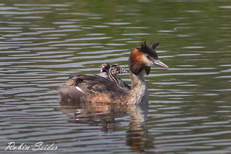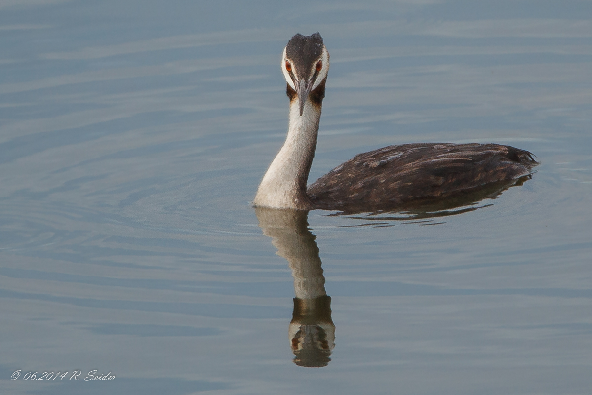 Der Haubentaucher (Podiceps cristatus) ist eine Vogelart aus der Familie der Lappentaucher (Podicipedidae). Haubentaucher sind 46 bis 51 cm lang und haben eine Flügelspannweite von 59 bis 73 cm. Sie werden zwischen 800 und 1400 g schwer. Der etwa stockentengroße Vogel ist der größte, häufigste und bekannteste Vertreter dieser Familie von Wasservögeln. Er brütet auf Süßwasserseen und größeren Teichen mit röhrichtbewachsenen Ufern. Besonders auffällig ist sein Balzverhalten, das auf freier Wasserfläche stattfindet und gut zu beobachten ist. Zu den Balzelementen gehört ein heftiges Kopfschütteln mit gespreizter Federhaube sowie die sogenannte Pinguin-Pose, bei denen sich die Vögel durch rasches Paddeln der Füße fast senkrecht voreinander aus dem Wasser heben. Quelle: Wikipedia