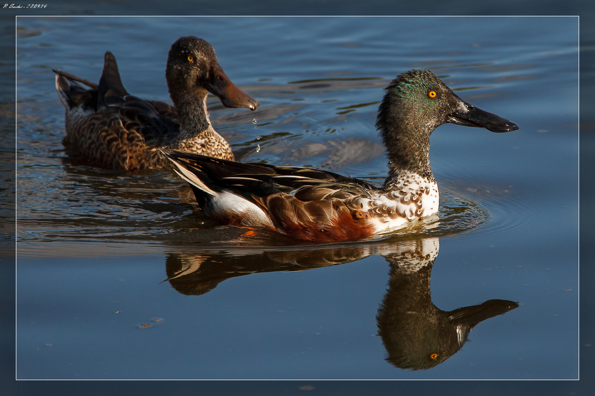 Die Löffelente (Anas clypeata) ist eine holarktisch verbreitete Vogelart aus der Familie der Entenvögel (Anatidae). Sie ist nur wenig kleiner als die Stockente. Der Erpel hat im Prachtkleid ein auffallend kontrastreiches Prachtkleid. In seiner Färbung erinnert es entfernt an das der Brandgans. Von dieser sind Löffelenten auf Grund ihrer kleiner Größe sowie ihres ententypischen Habitus sicher zu unterscheiden. Quelle: Wikipedia