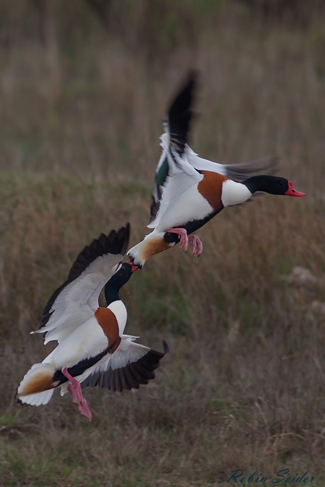 Die Brandgans (Tadorna tadorna) ist eine Art aus der Familie der Entenvögel, die zur Unterfamilie der Halbgänse (Tadorninae) gehört. Brandgänse erreichen ausgewachsen eine Körperlänge von 58 bis 67 cm und haben eine Flügelspannweite von 110 bis 133 cm. Das Gewicht schwankt sehr stark. Die Art hat eine gänseartige Gestalt und ist auf Grund der auffallend kontrastreichen Färbung des Gefieders unverwechselbar. Durch die Gefiederfärbung besteht zwar eine entfernte Ähnlichkeit mit der Löffelente, die Größe der Brandgans, ihre Langbeinigkeit sowie ihre Körperhaltung und ihr kurzer Schnabel schließen jedoch aus, dass sie mit dieser Ente verwechselt werden kann. Quelle: Wikipedia