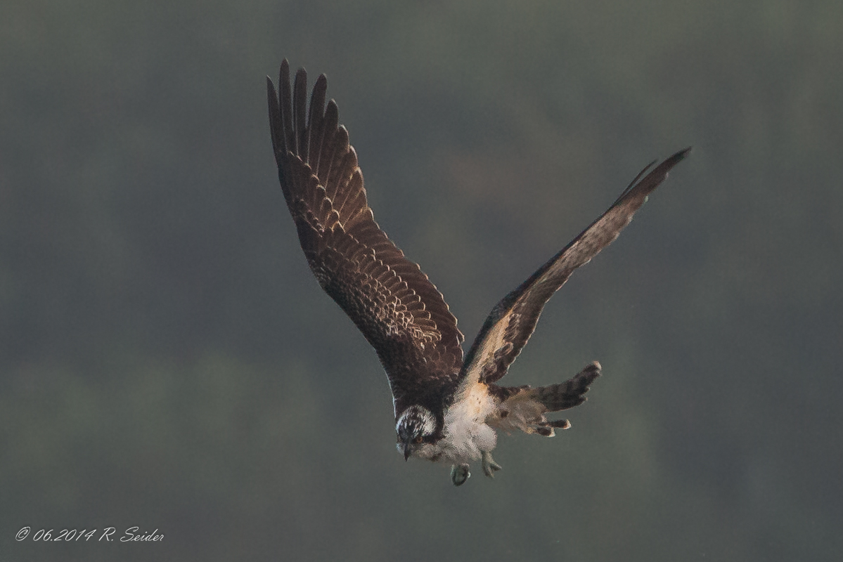 Der Fischadler (Pandion haliaetus) ist eine Vogelart aus der Ordnung der Accipitriformes. Fischadler sind mittelgroße, schlanke und langflügelige Greifvögel. Die Körperlänge beträgt 50 bis 66 cm, die Flügelspannweite beträgt 1,27 bis 1,74 m. Weibchen sind im Mittel größer und schwerer als Männchen. Weibchen der Nominatform P. h. haliaetus haben eine Flügellänge von 470 bis 518 mm und ein Gewicht von 1,21 bis 2,05 kg, Männchen erreichen eine Flügellänge von 448 bis 495 mm und ein Gewicht von 1,12 bis 1,74 kg. Quelle: Wikipedia
