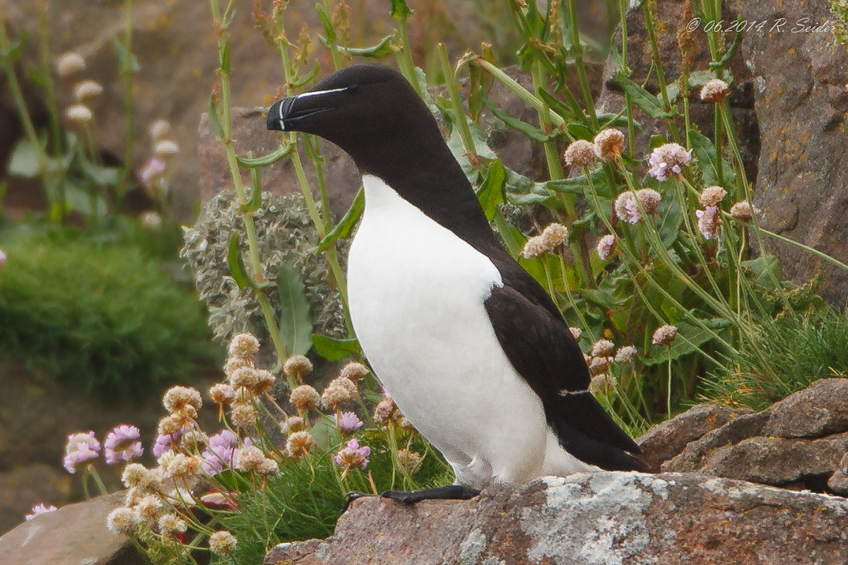 Der Tordalk (Alca torda) ist ein Vogel in der Familie der Alkenvögel und (nach Ausrottung des Riesenalks im 19. Jahrhundert) der einzige rezente Vertreter der Gattung Alca. Der Tordalk ist ein kräftig gebauter Alkenvogel mit einem hohen und seitlich zusammengedrückten Schnabel sowie einem für einen Alkenvogel ungewöhnlich langen Schwanz. Auf dem Wasser und im Flug erinnert er an Lummen, von denen er sich jedoch durch seinen kräftigeren Schnabel und den längeren Schwanz unterscheidet. Erwachsene Tiere sind 38 bis 43 cm lang und haben eine Flügelspannweite von 60 bis 69 cm. Sie wiegen zwischen 600 und 800 g und sind damit um etwa 22 Prozent leichter als die ihnen sehr ähnlich sehende Trottellumme Quelle: Wikipedia