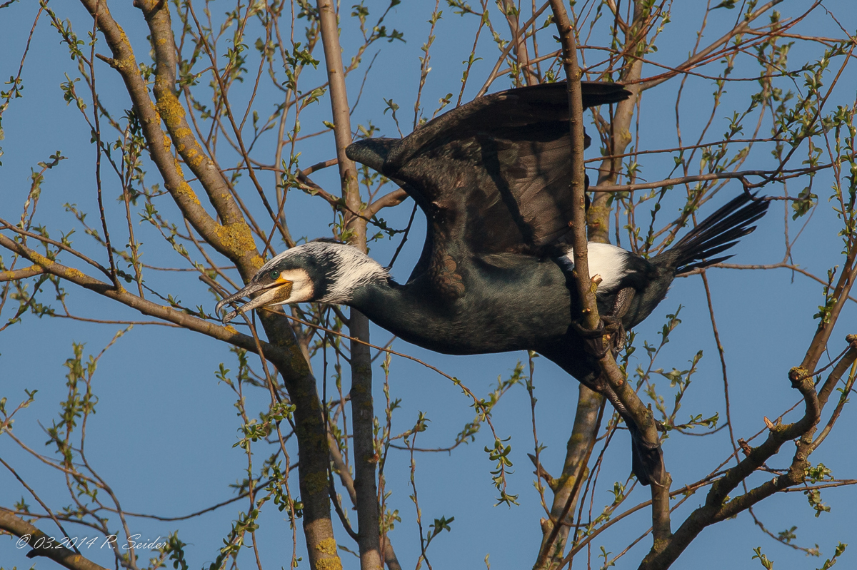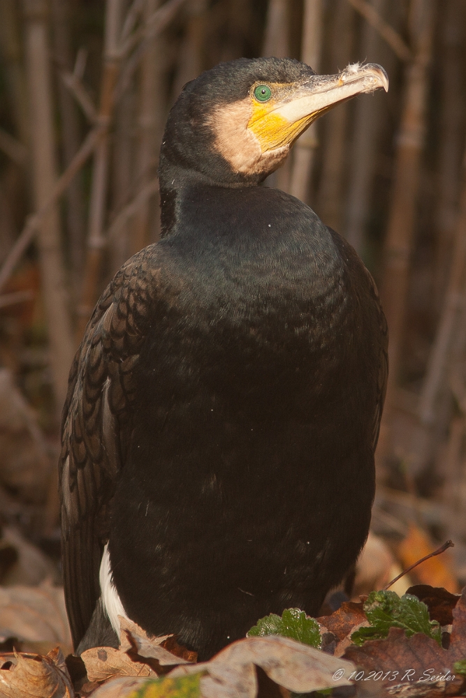 Die Kormorane (Phalacrocorax) sind eine Gattung aus der Ordnung der Ruderfüßer (Pelecaniformes). Tragen die Vögel einen Federschopf, werden sie als „Scharben“, sonst als „Kormorane“ bezeichnet, doch entspricht diese Einteilung nicht den tatsächlichen Verwandtschaftsverhältnissen. Im Volksmund heißen diese Vögel auch „Seeraben“, „Meerraben“ oder „Wasserraben“. Kormorane sind knapp gänsegroß, sie haben eine Körperlänge von 77 bis 94 cm und eine Flügelspannweite von 121 bis 149 cm. Männchen sind etwas größer und schwerer als Weibchen. Die Gewichte von Männchen schwanken zwischen 1975 und 3180 g, Weibchen erreichen 1673–2555 g. Quelle: Wikipedia