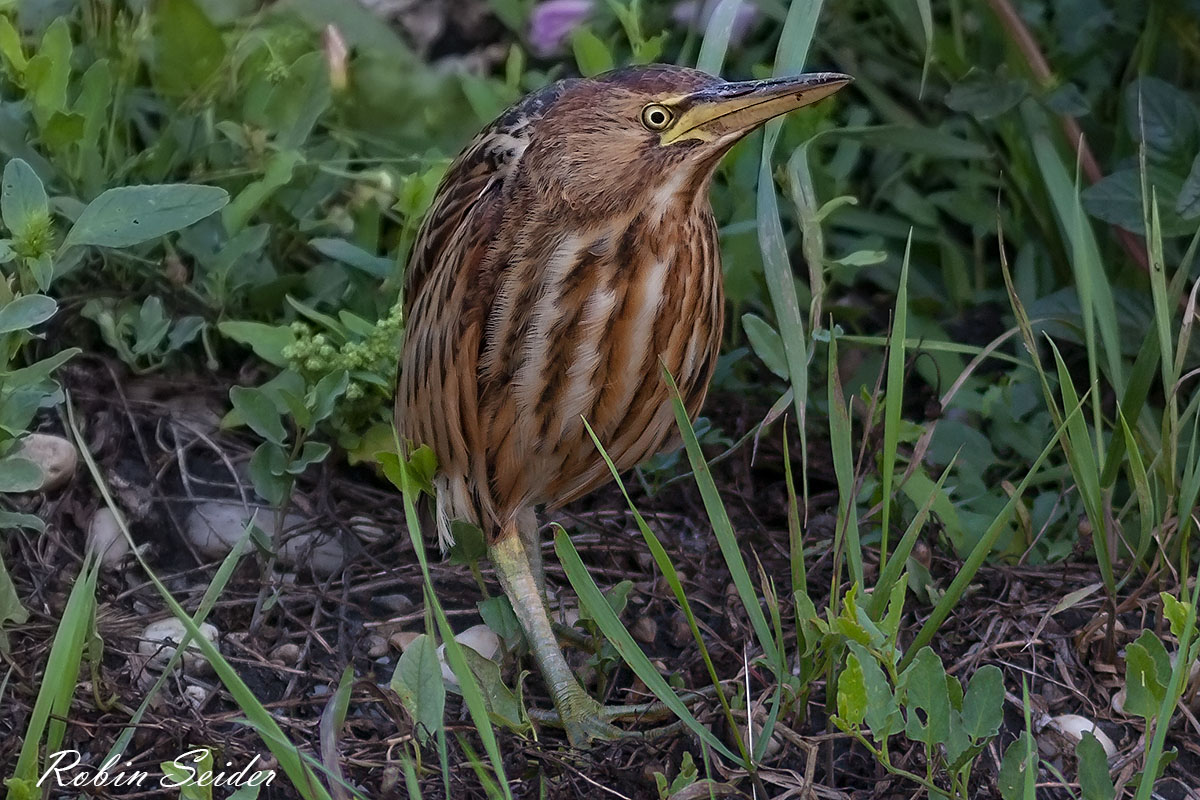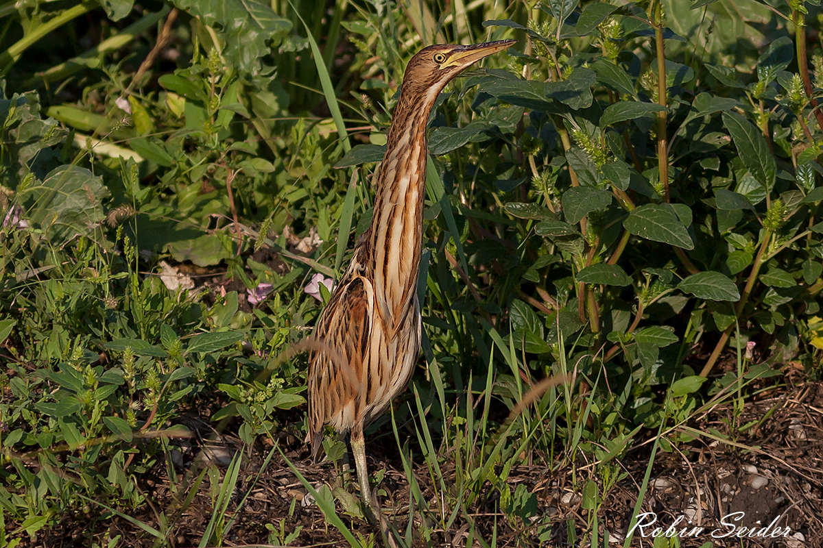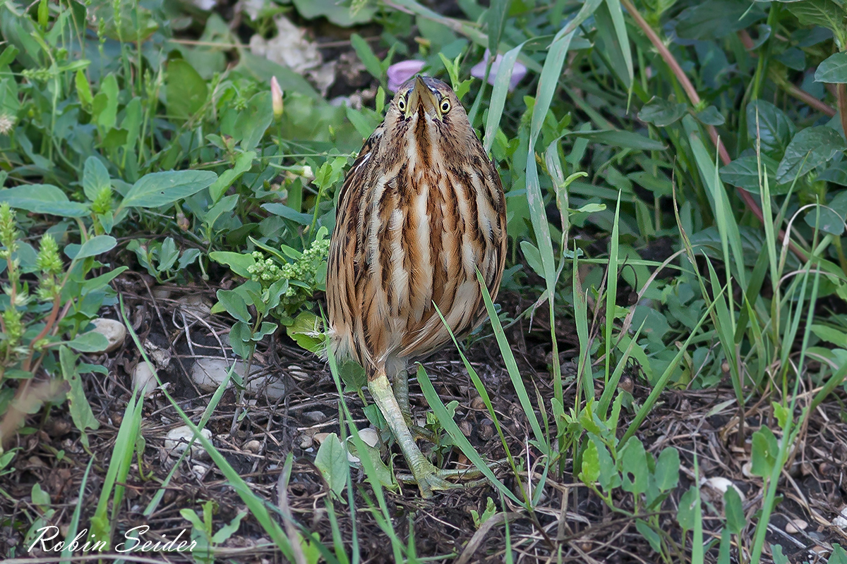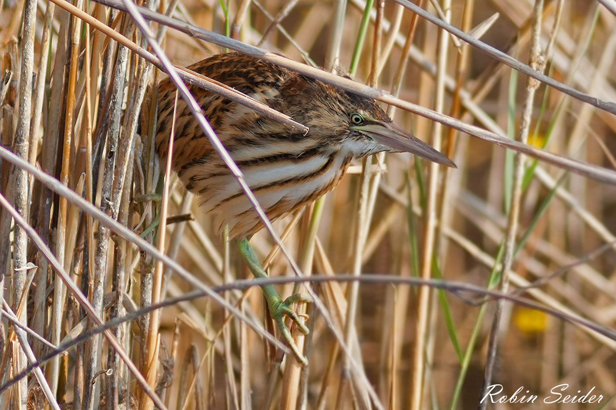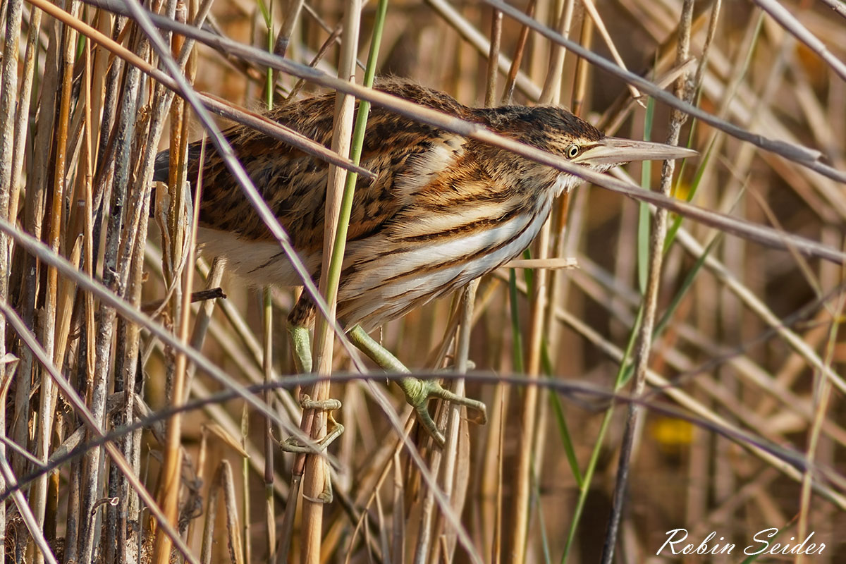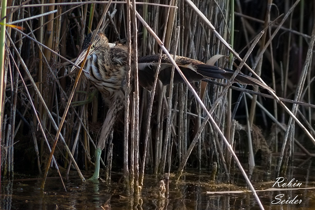 Die Rohrdommel (Botaurus stellaris) ist ein Vogel aus der Familie der Reiher (Ardeidae). In der Abgrenzung zur Zwergdommel wird sie teilweise auch als „Große Rohrdommel“ bezeichnet. Die Rohrdommel ist damit etwas größer als ein Haushuhn und von gedrungener Gestalt mit kurzem, dicken Hals und kurzen Beinen, einem relativ kurzen, kräftigen grün-gelben Schnabel (an der Spitze mit fein gesägten Hornschneiden). Das Gefieder ist fein schwarz, gelbbraun und weiß gestreift.Kinn und Kehle sind cremeweiß und weisen in der Mitte einen rötlich-braunen Längsstreifen auf. Das Federkleid imitiert ein Muster aus Licht und Schatten, das die Konturen des Vogels selbst hinter wenigen Schilfhalmen auflöst. Nähert man sich der Rohrdommel, nimmt sie bis auf geringe Distanz die so genannte Pfahlstellung ein. Quelle: Wikipedia