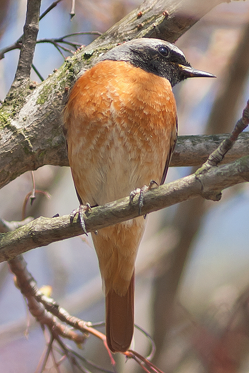 Der Gartenrotschwanz (Phoenicurus phoenicurus) ist eine Vogelart aus der Familie der Fliegenschnäpper (Muscicapidae). Der Gartenrotschwanz ist wie der Hausrotschwanz um die 13 bis 14,5 cm lang. Das Gewicht beträgt zwischen 12 und 20 g. Das Männchen ist auffallend kontrastreich gefärbt: Gesichtsfeld und Kehle sowie die Partie direkt über dem Schnabel sind schwarz, die Stirn sowie ein auslaufender, bis zu den Ohrdecken reichender Überaugenstreif hingegen reinweiß. Oberkopf, Nacken und Rücken sind grau. Die Brustpartie ist lebhaft rostrot gefärbt, zum weißlichen Unterbauch hin läuft sie durch breiter werdende helle Federsäume aus. Quelle: Wikipedia