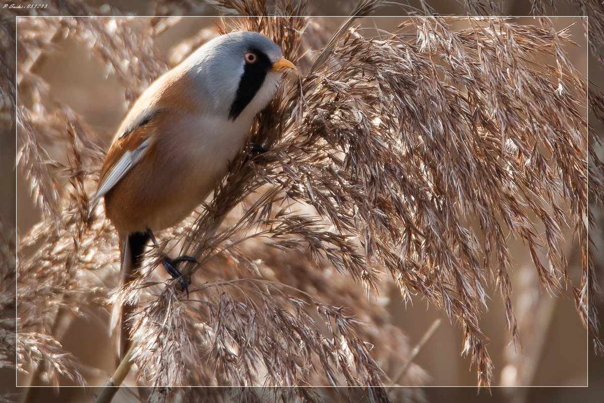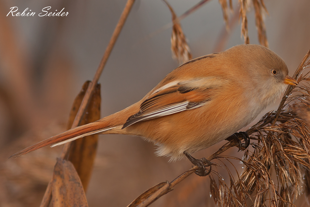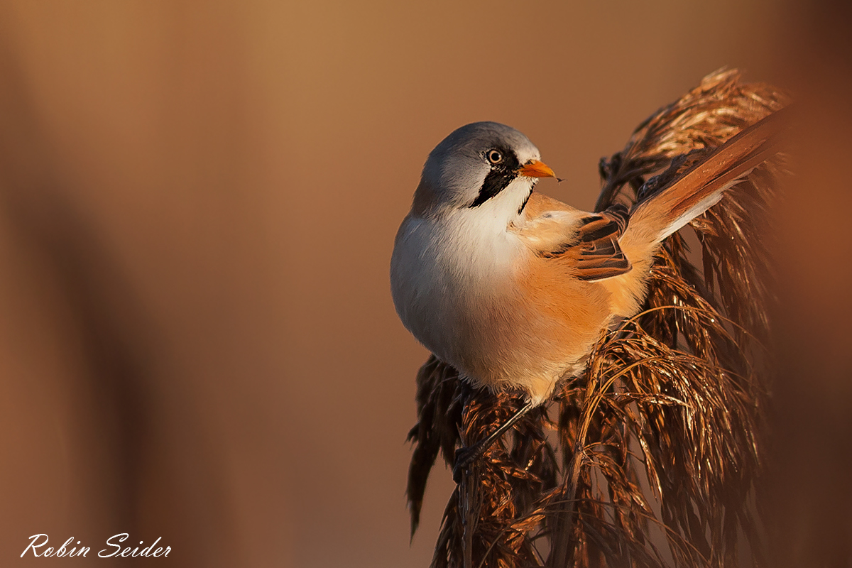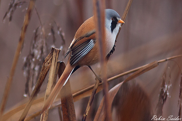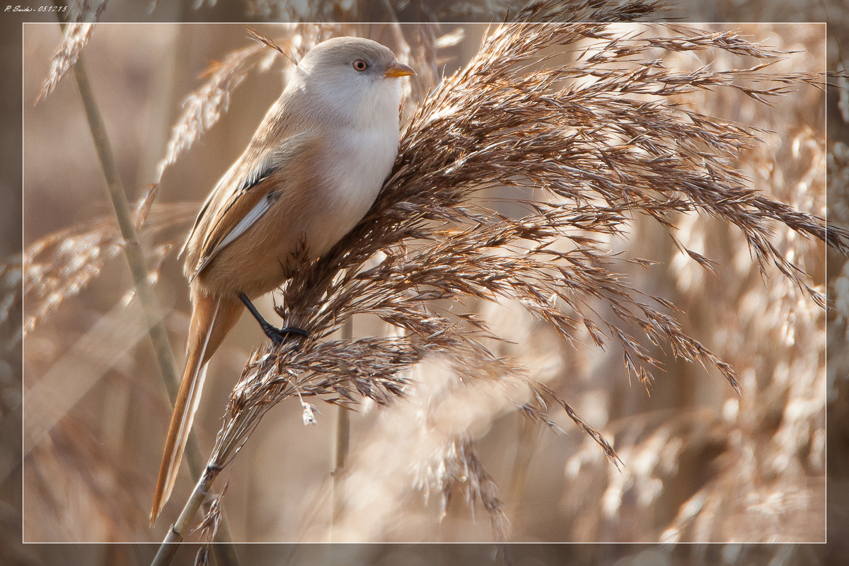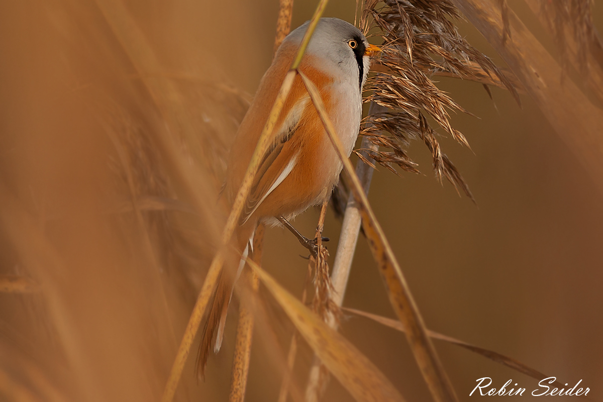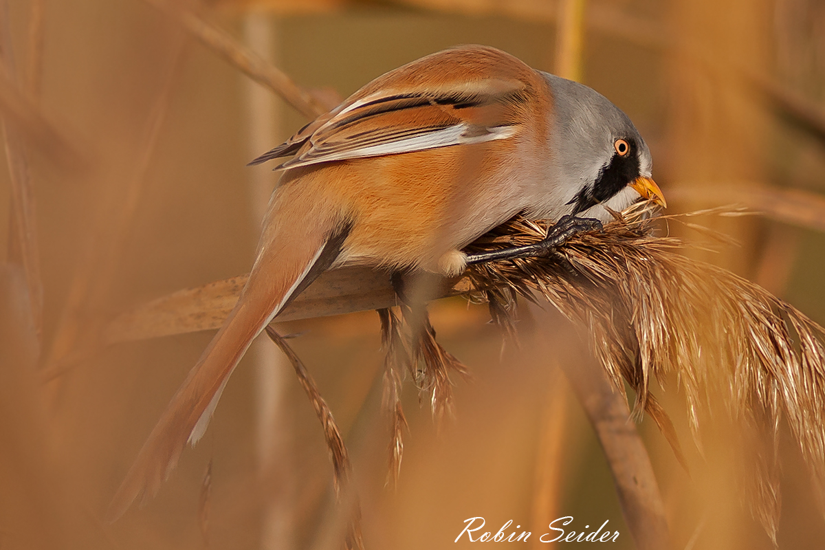 Die Bartmeise (Panurus biarmicus) ist eine Vogelart und wird heute meist als einzige Art der damit monotypischen Panuridae betrachtet. Sie ist ein meisenartiger, langschwänziger Bewohner großer Schilfflächen. Ihre Länge beträgt zwischen 14 und 15,5 cm. Sie ist klein, hell gelbbraun und hat einen hell gelbbraunen Schwanz. Das adulte Männchen besitzt einen hell blaugrauen Kopf mit langem schwarzen Bartstreif und weißer Kehle. Die Unterschwanzdecken sind weiß. Bei dem adulten Weibchen dagegen ist der Kopf beigebraun ohne schwarzen Bart. Die Kehle ist schmutzigweiß und die Unterschwanzdecken sind beige. Jungvögel ähneln adulten Weibchen, haben jedoch eine schwarze Mantelmitte und schwarze Bereiche im Schwanz. Ihr Gefieder ist eher gelbbeige. Quelle: Wikipedia