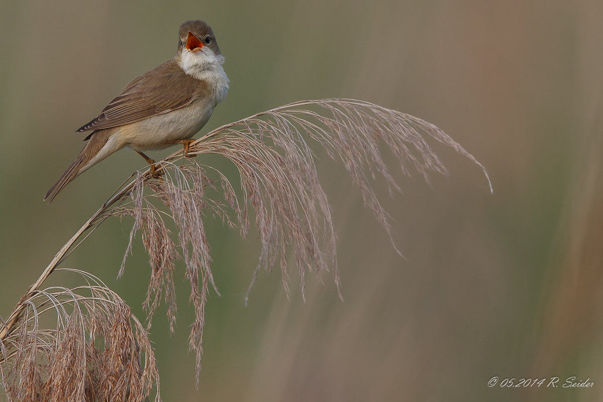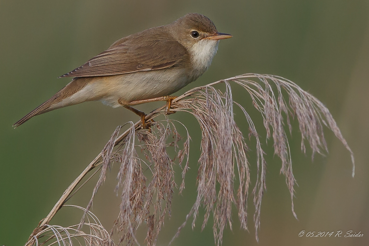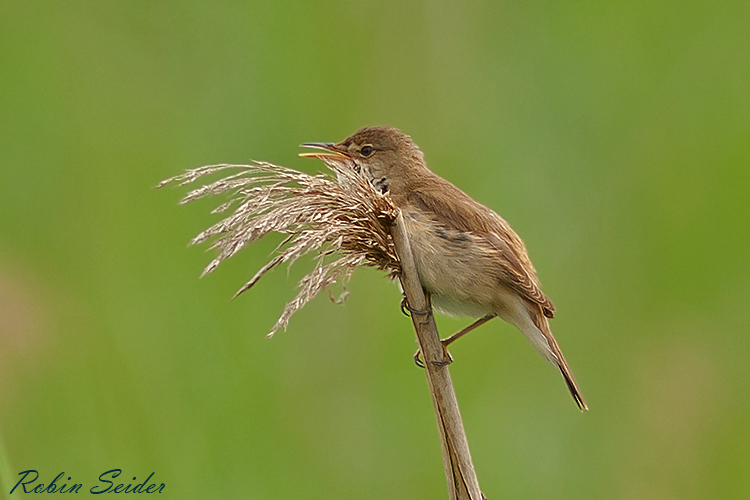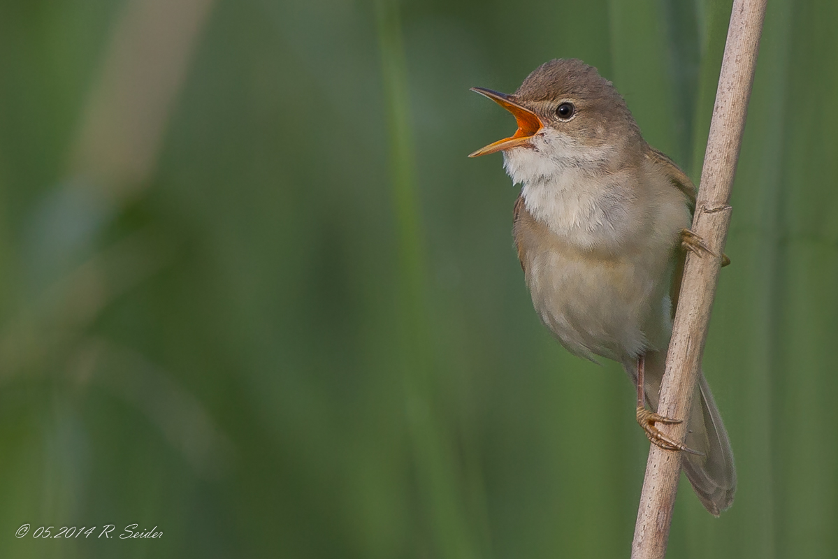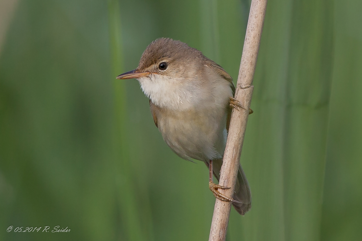 Der Teichrohrsänger (Acrocephalus scirpaceus), im Volksmund auch Rohrspatz genannt, ist eine Singvogelart aus der Gattung der Rohrsänger (Acrocephalus) und der Familie der Grasmückenartigen (Sylviidae). Der Teichrohrsänger ist etwa 13 cm lang und hat eine Flügelspannweite von 17 bis 21 cm. Das Gewicht beträgt etwa 10 bis 15 Gramm. Die Oberseite ist braun, sein Unterseite gelblichweiß. Der kleine Vogel hat eine weißliche Kehle, einen spitzen Schnabel und graubraune Beine. Männchen und Weibchen haben die gleiche Färbung. Ein Teichrohrsänger kann bis 12 Jahre alt werden. Sein kurzer unauffälliger Ruf klingt wie „tscharr“ und „tschirrak“. Allein dem Aussehen nach ist der Teichrohrsänger nur schwer vom Sumpfrohrsänger zu unterscheiden. Quelle: Wikipedia