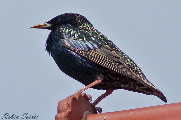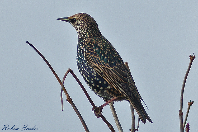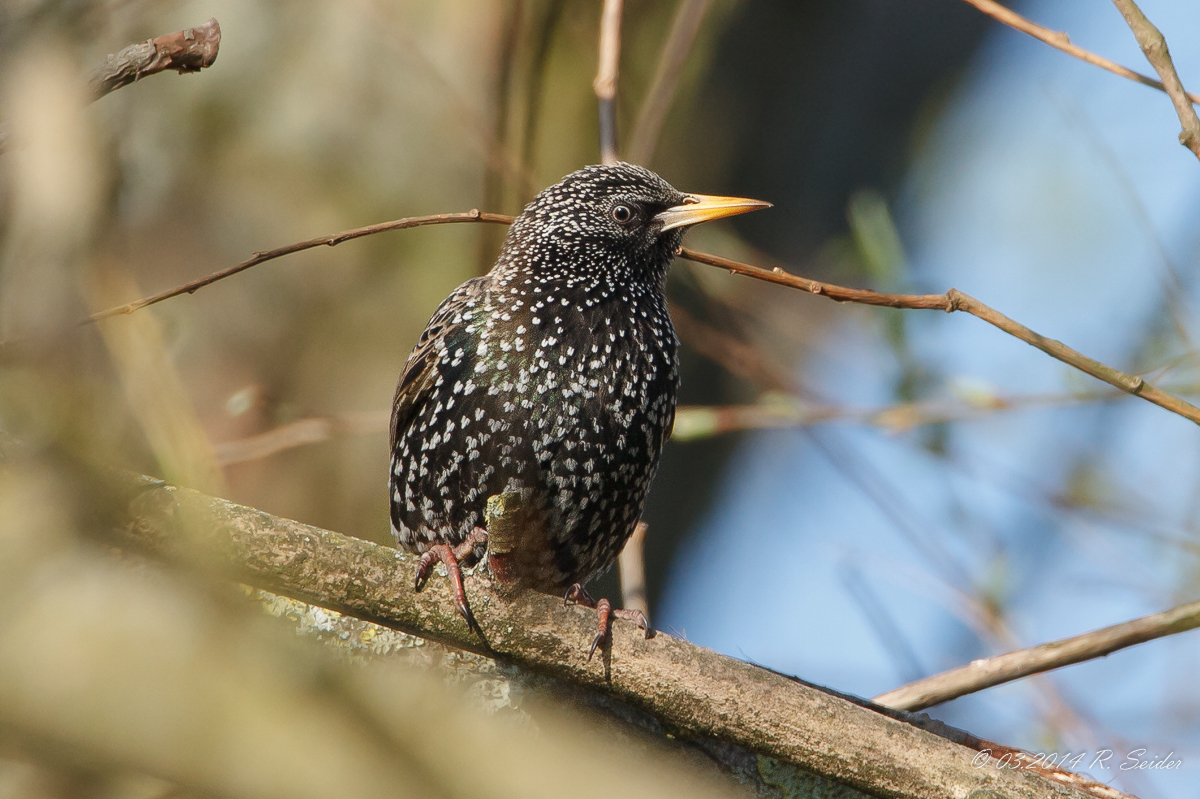 Der Star (Sturnus vulgaris) ist der in Eurasien am weitesten verbreitete und häufigste Vertreter der Familie der Stare (Sturnidae). Der Star ist mit einer Körperlänge von 19 bis 22 cm etwas kleiner als die Amsel. Der Schwanz ist im Vergleich zur Amsel deutlich kürzer. Die Flügel wirken im Flug dreieckig und spitz. Männliche Stare des nominotypischen Taxons wiegen im Mittel 81 g, Weibchen sind mit im Mittel 76 g etwas leichter. Durch zahlreiche Einbürgerungen auf anderen Kontinenten ist der Star heute einer der häufigsten Vögel der Welt. Quelle: Wikipedia